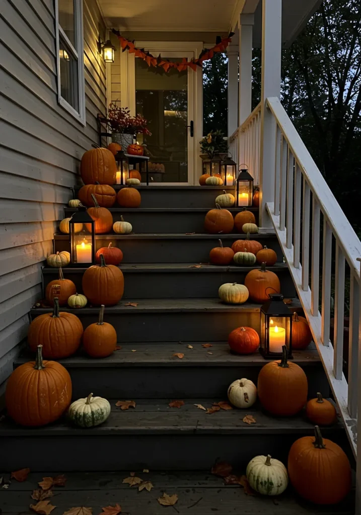 This charming front porch is all about cozy fall magic with pumpkins in every size and color lining the steps. The mix of bright orange and creamy white pumpkins gives it such a natural, gathered-from-the-patch vibe. Soft lantern light spills across the stairs, creating the most welcoming glow as the sun goes down. A simple garland above the door ties everything together with just the right touch of festive cheer.