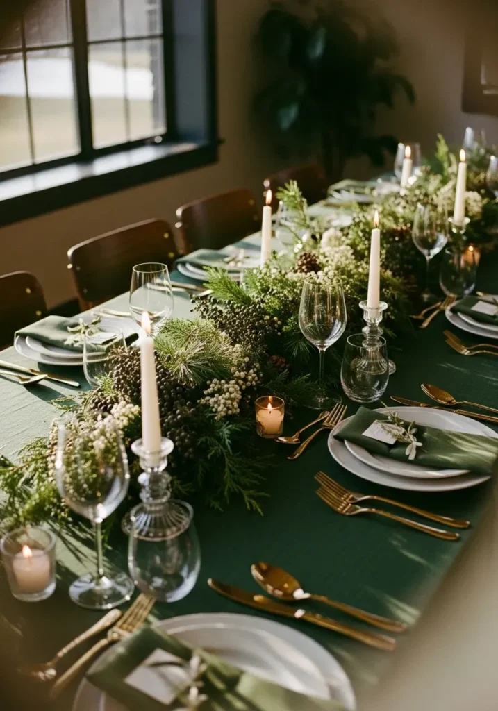 This table setting feels straight out of a cozy holiday movie. The deep green tablecloth pairs beautifully with gold flatware, crystal glasses, and tall white candles that glow softly against the greenery centerpiece. Pine sprigs and delicate berries add a fresh touch, while the flicker of candlelight creates a warm, romantic mood perfect for a festive dinner.