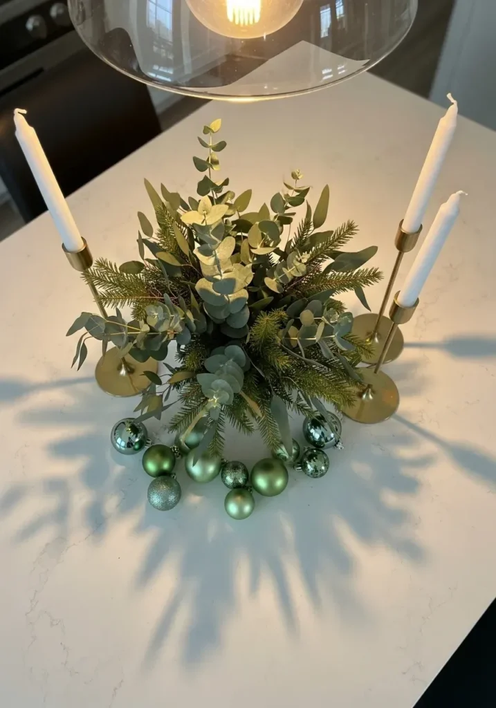 Fresh eucalyptus, pine branches, and modern gold candlesticks create a balanced centerpiece that feels both organic and chic. A scattering of green ornaments adds depth and color, reflecting the candlelight beautifully on the smooth countertop.