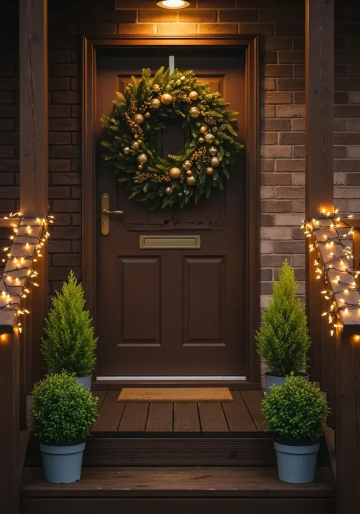 A dark front door pops against a lush green wreath filled with gold ornaments and twinkling lights. Potted evergreens line the steps, glowing softly under warm string lights that make the entryway feel inviting and cozy.