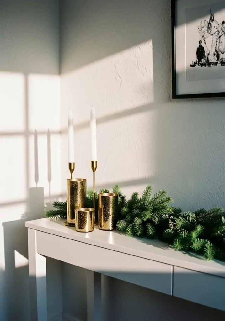 This quiet corner setup is all about soft sunlight, gold candleholders, and a classic pine garland. The mix of metallic shine and fresh greenery feels refined but approachable, perfect for a hallway or entryway table.