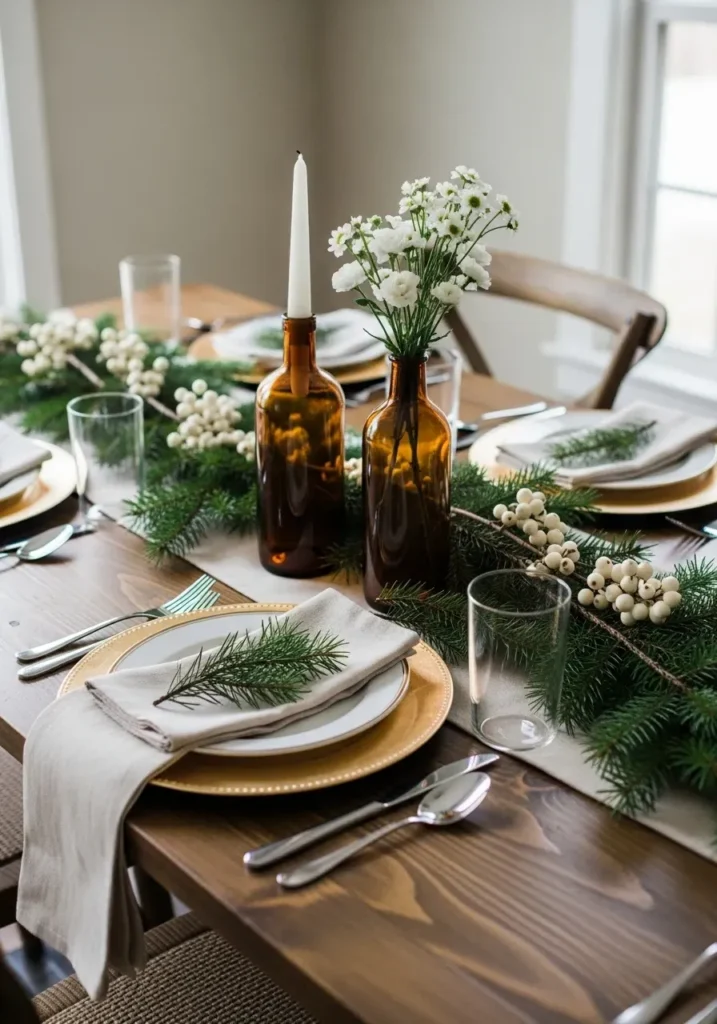 This table feels beautifully relaxed with its mix of earthy tones and natural textures. Amber glass bottles serve as vases and candle holders, blending perfectly with the pine greenery and soft beige napkins. Each place setting is topped with a small pine sprig, adding a rustic yet refined holiday feel.