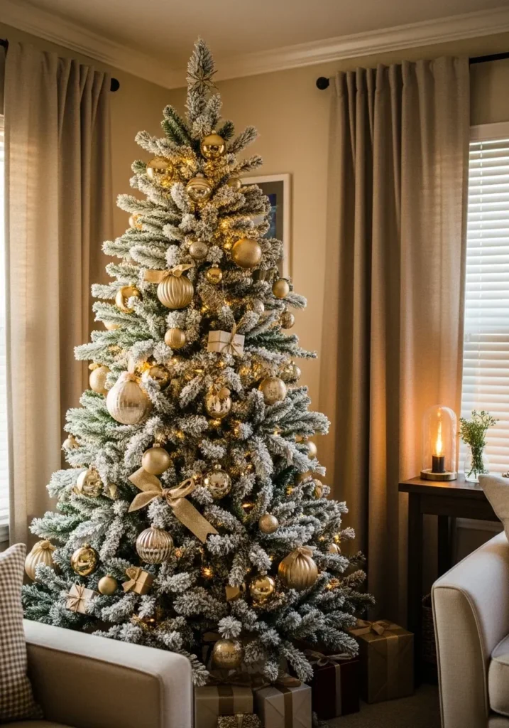 A frosted Christmas tree shimmers with soft gold ornaments, ribbons, and twinkling lights. The muted tones of the room make the golden glow even more beautiful, creating a timeless and serene holiday atmosphere.