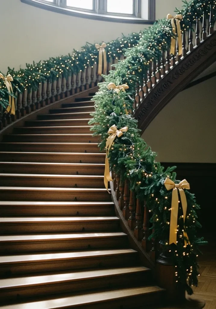 A sweeping staircase becomes a festive centerpiece with full garlands wrapped in golden ribbons and warm fairy lights. The deep green of the pine contrasts perfectly with the polished wood, creating an inviting, elegant entryway moment.