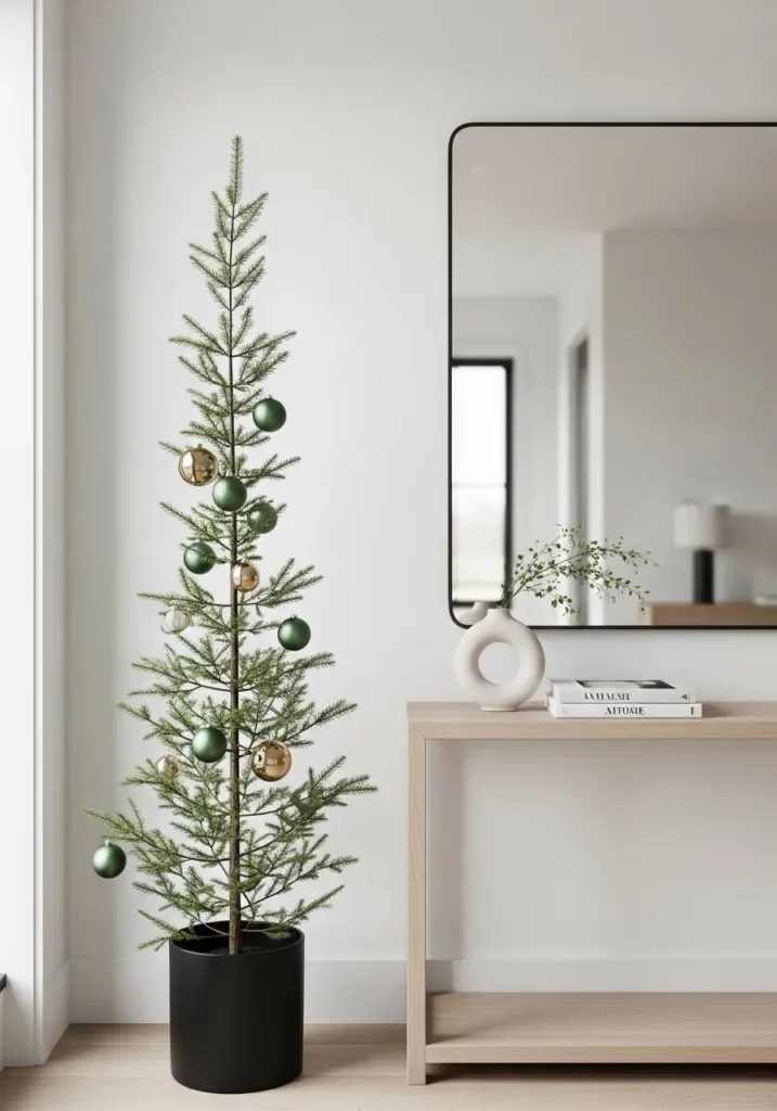 This minimalist Christmas tree proves that simplicity can be stunning. Set in a sleek black pot, it’s adorned with green and gold ornaments that complement the clean lines of the modern interior. The light wood console beside it ties everything together beautifully.