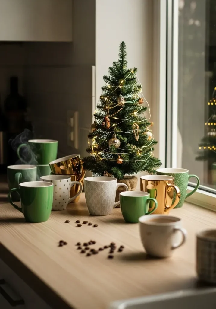 A tiny Christmas tree twinkles with fairy lights beside an inviting row of mugs in shades of green, white, and gold. The warm wood countertop and soft lighting make it feel like a cozy coffee nook made for winter mornings.