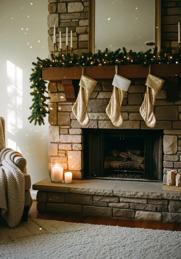 This cozy fireplace scene is pure Christmas comfort. A garland with soft lights drapes across the mantle, while shimmering gold stockings hang above flickering candles. The stone backdrop and chunky knits nearby add that perfect rustic touch.