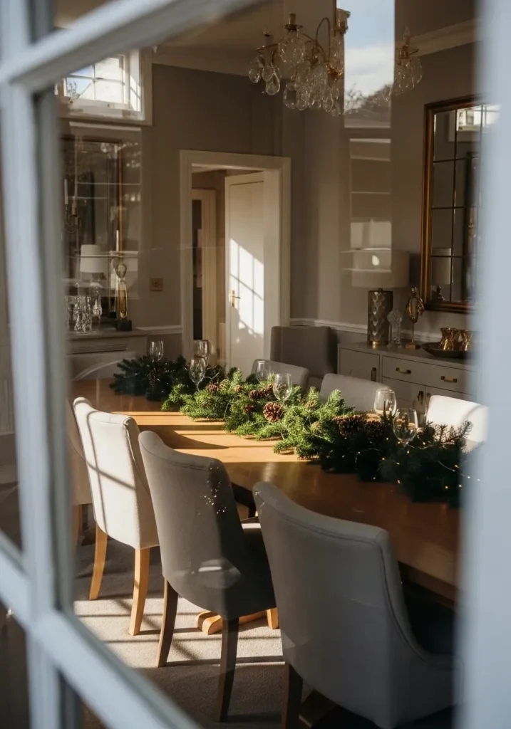 This dining room feels elegant and timeless with its neutral tones, crystal chandelier, and soft sunlight reflecting off gold-framed mirrors. The table centerpiece of pine greenery and pinecones adds a festive touch without overpowering the room, creating a calm and classic holiday setting.