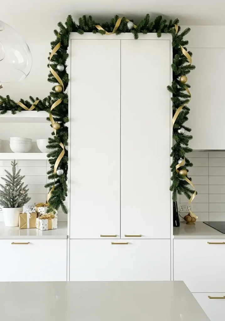 A simple touch of Christmas magic transforms this modern kitchen. A lush green garland drapes around the cabinet, dotted with gold and silver baubles and a golden ribbon that adds just the right amount of shimmer. The white backdrop makes the greenery pop, and a few neatly wrapped gifts complete the peaceful holiday look.