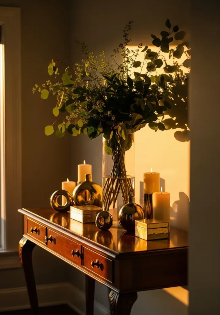 A wooden console table glows beautifully in the evening light, covered with golden ornaments, candles, and a tall vase filled with lush greenery. The mix of textures and the warm golden tones make the scene both festive and romantic.