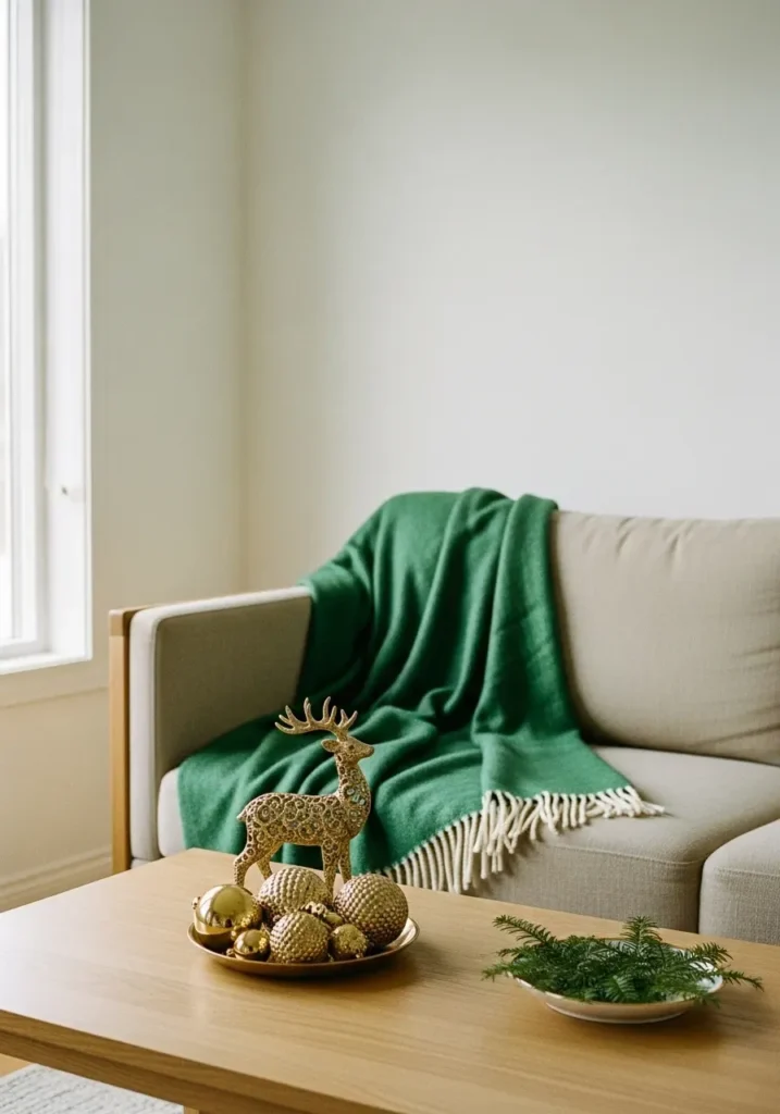 A cozy beige sofa becomes a festive focal point with a bold green throw and a golden reindeer statue perched on a tray of ornaments. The neutral backdrop makes the colors pop, creating a calm yet cheerful Christmas corner.