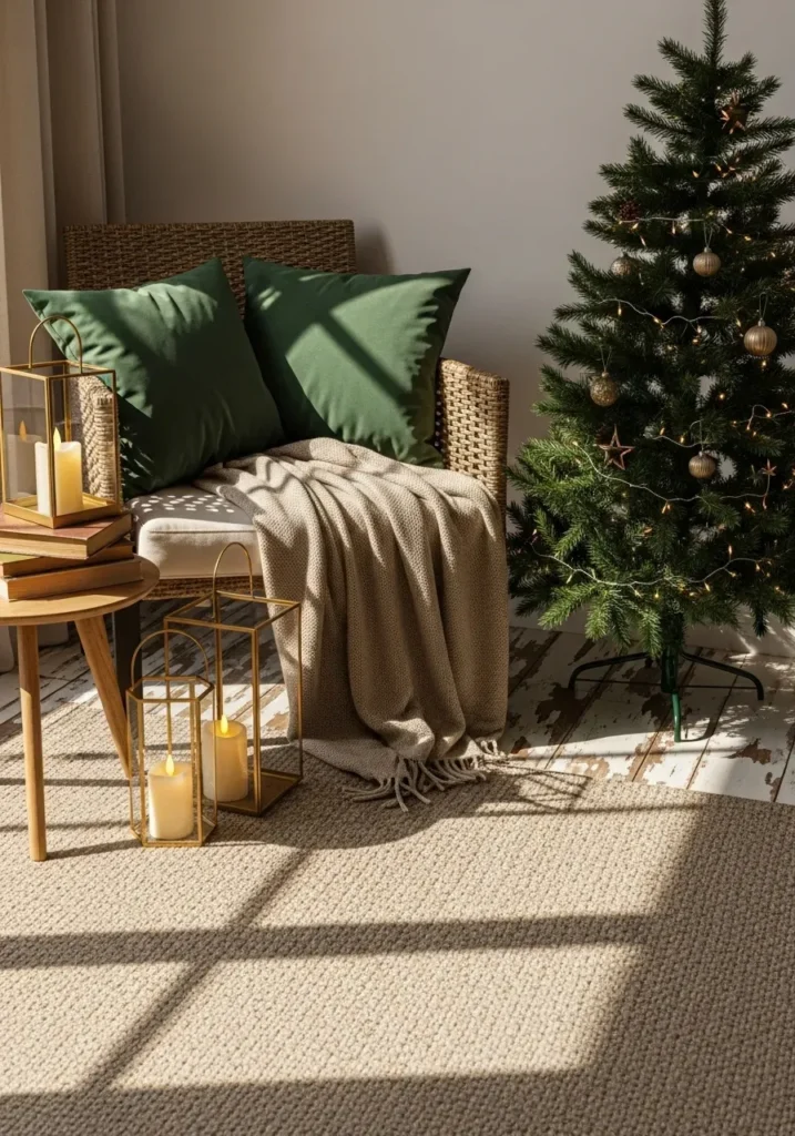 A small potted tree decorated with soft green ornaments stands next to a chair draped in thick, knitted blankets. Sunlight pours in, making the neutral tones and natural textures feel even cozier. It’s simple, relaxed, and quietly festive without shouting for attention.