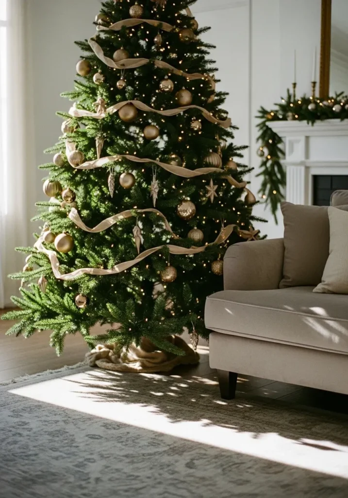 A lush green tree dressed in golden ribbon and ornaments takes center stage in this elegant living room. The natural sunlight enhances the warm glow of the decorations, creating a cozy yet polished atmosphere.