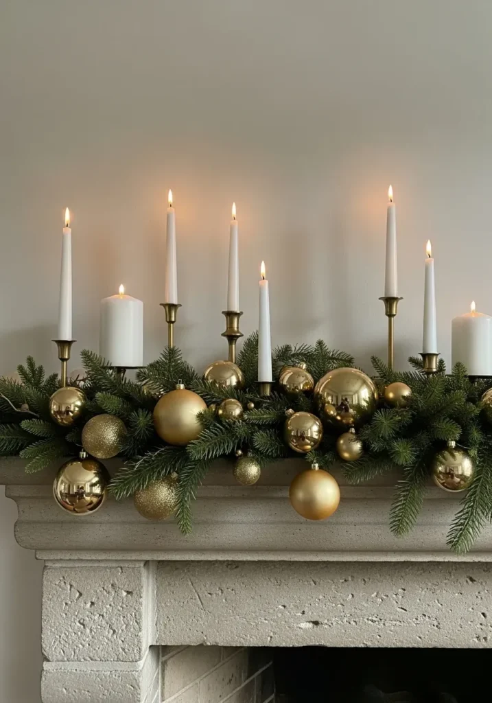 A timeless mantle scene filled with glowing candles and layers of evergreen branches. Gold ornaments in matte and glossy finishes reflect the candlelight beautifully, creating a rich, elegant atmosphere. The mix of different candle heights adds that effortlessly styled look.