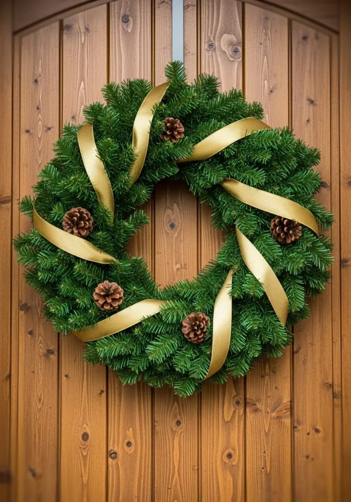 This fresh green wreath is dressed with a soft gold ribbon that winds through its branches, finished off with natural pinecones for a rustic touch. Hanging against a wooden door, it feels earthy, festive, and wonderfully timeless.