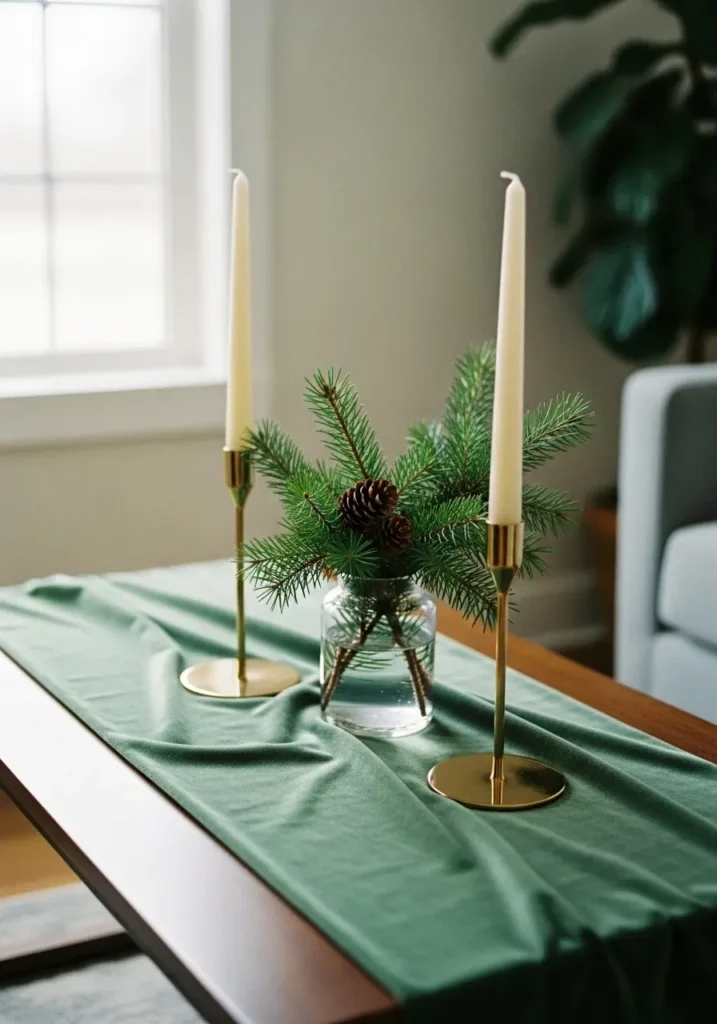 A sleek, minimalist setup featuring two tall gold candlesticks and a small glass vase filled with pine sprigs and pinecones. The soft green runner underneath ties everything together, creating a calm and modern Christmas moment.