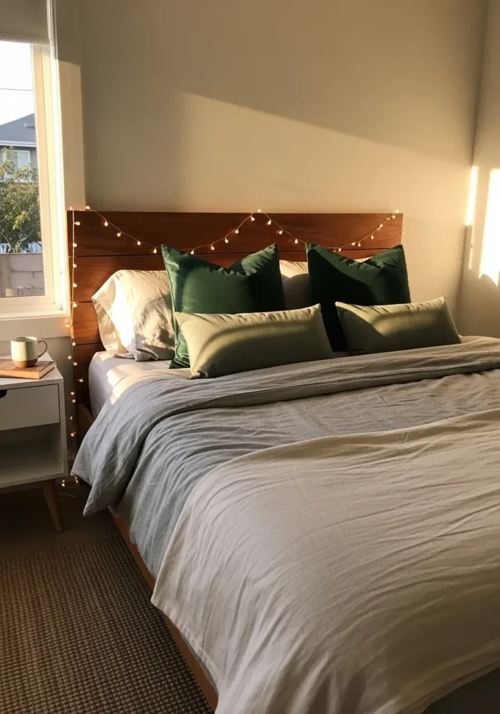 Soft morning light fills this serene bedroom, where green velvet pillows bring a festive yet calming touch to the neutral bedding. Twinkling string lights along the wooden headboard add just the right amount of holiday glow, making the space feel cozy and personal.