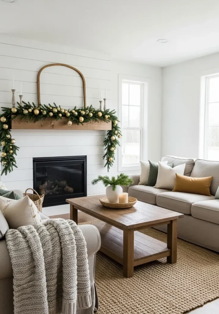 This bright and inviting living room blends modern comfort with Christmas charm. A lush green garland draped across the mantle sparkles with gold ornaments, tying beautifully with the soft neutrals of the room. The mix of natural wood, textured blankets, and subtle gold touches creates that cozy-yet-polished balance.