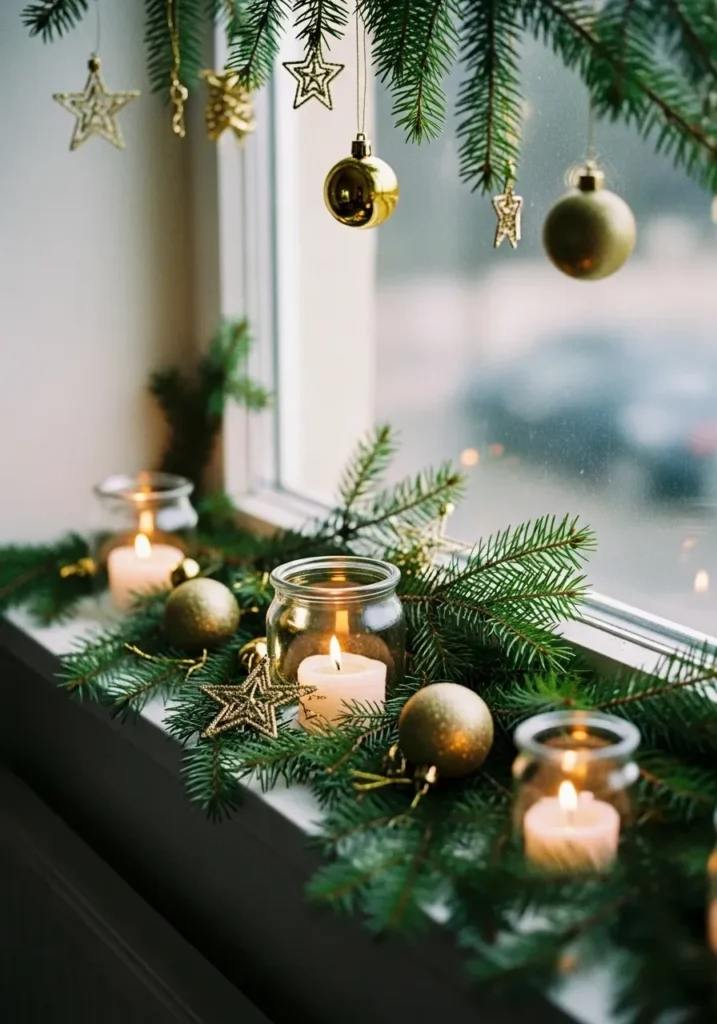 A simple windowsill becomes a glowing Christmas vignette with pine branches, gold ornaments, and star-shaped decorations. Small glass jars hold candles that cast a warm flicker against the window, making the whole setup feel timeless and romantic.