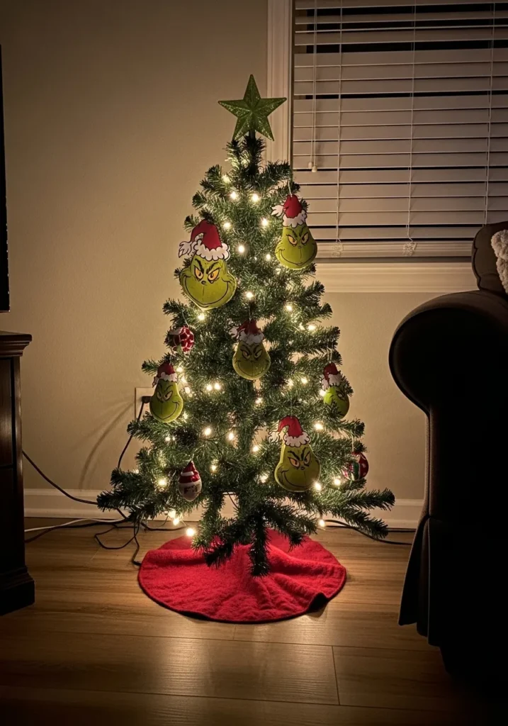 This playful little Christmas tree is a total mood booster. Decorated with glowing string lights and topped with a green star, it’s cheeky and festive at the same time. The ornaments feature the Grinch’s signature smirk in Santa hats, bringing that mischievous Whoville charm right into a cozy living room corner. The simple red tree skirt adds a pop of color and keeps the setup grounded and homey.