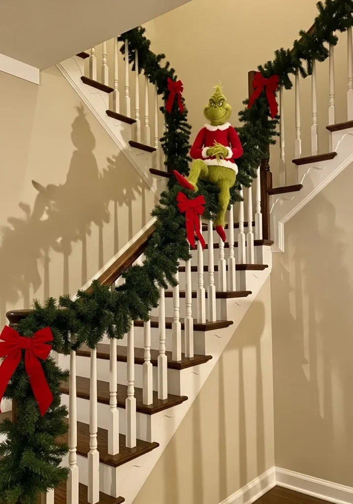 This staircase design is a showstopper. A large Grinch figure sits right on the railing, surrounded by lush green garland and big red bows. The greenery follows the staircase perfectly, creating a stunning focal point that feels festive and fun all at once.