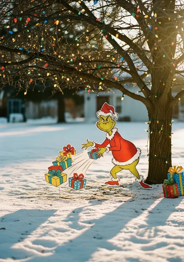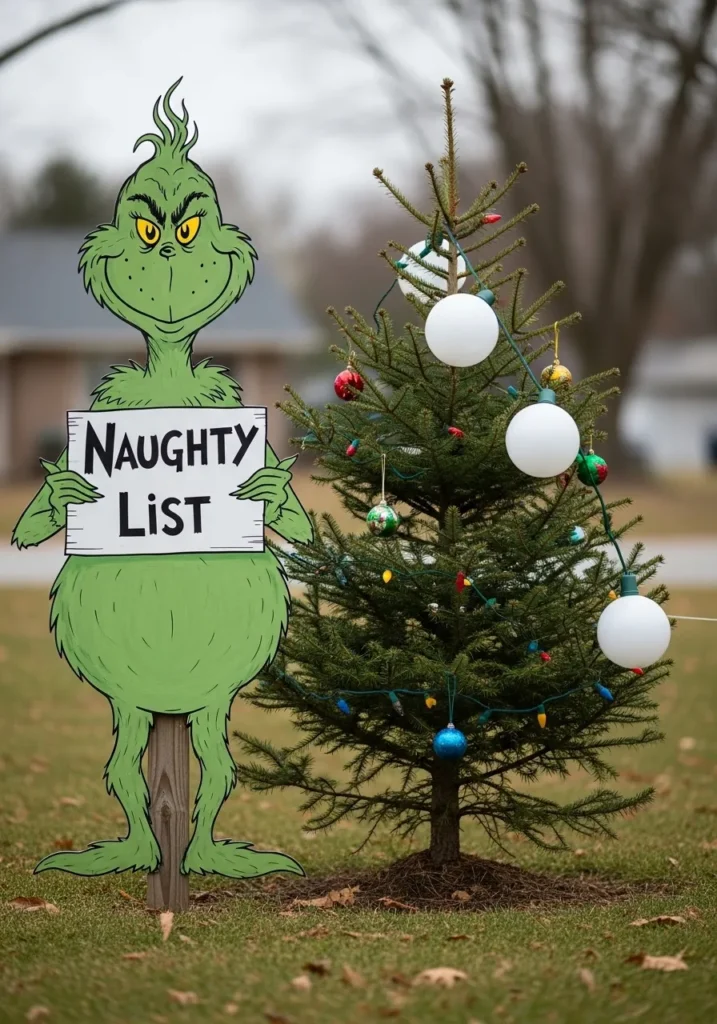 This outdoor décor idea brings laughter right to the lawn. A big cutout of the Grinch holds a “Naughty List” sign beside a small Christmas tree wrapped in colorful lights and ornaments. It’s bold, funny, and totally attention-grabbing—exactly what a Grinch display should be.