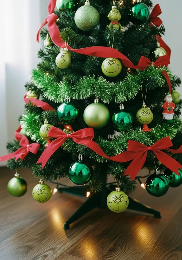 This Christmas tree feels perfectly balanced between festive and mischievous. Bright green and metallic ornaments mix with red bows and tinsel, while the Grinch’s grinning face appears on a few of the baubles for that signature touch. The glossy ornaments catch the light beautifully, making the tree sparkle with personality.