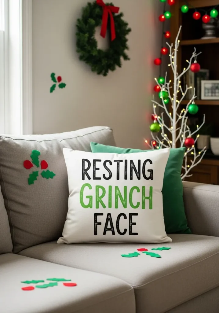 This living room is a perfect mix of cozy and witty. A throw pillow boldly reads “Resting Grinch Face” on a neutral sofa, surrounded by simple green and red accents like a wreath and string lights. The playful text keeps things lighthearted while fitting seamlessly into the Christmas palette.