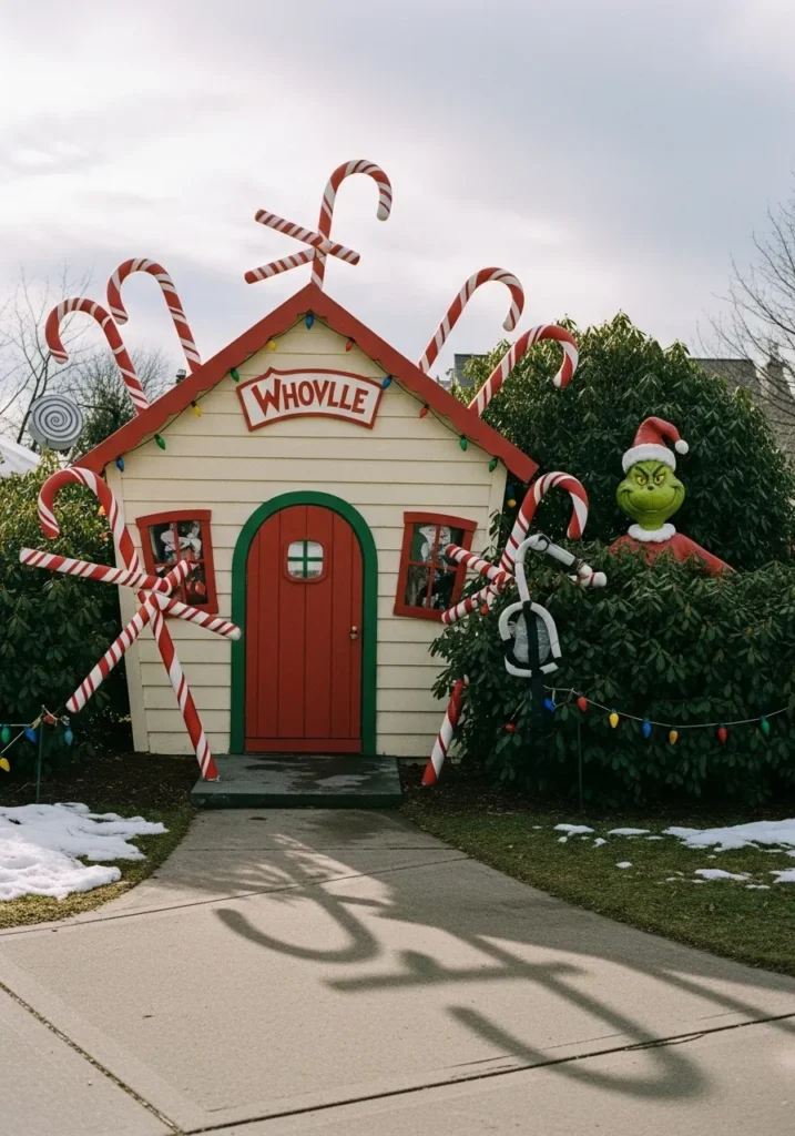 This outdoor setup looks straight out of a Christmas movie. A little house trimmed with oversized candy canes, bright string lights, and a bold red-and-green color scheme creates the perfect Whoville vibe. The Grinch peeking from behind the bushes completes the scene with his signature grin.