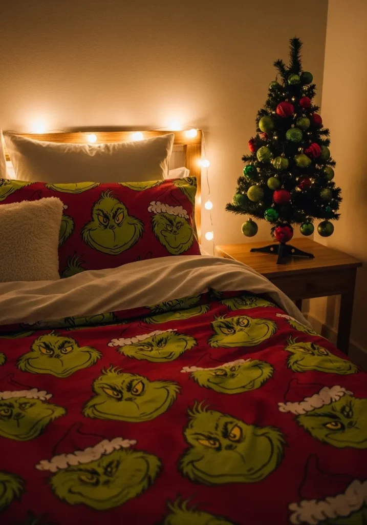 This bedroom brings Christmas spirit to bedtime in the best way. The Grinch-themed bedding pops with bright red and green hues, and the playful expressions on the comforter instantly set a lighthearted mood. A mini Christmas tree glows softly on the nightstand, while warm string lights along the headboard add that dreamy holiday glow.
