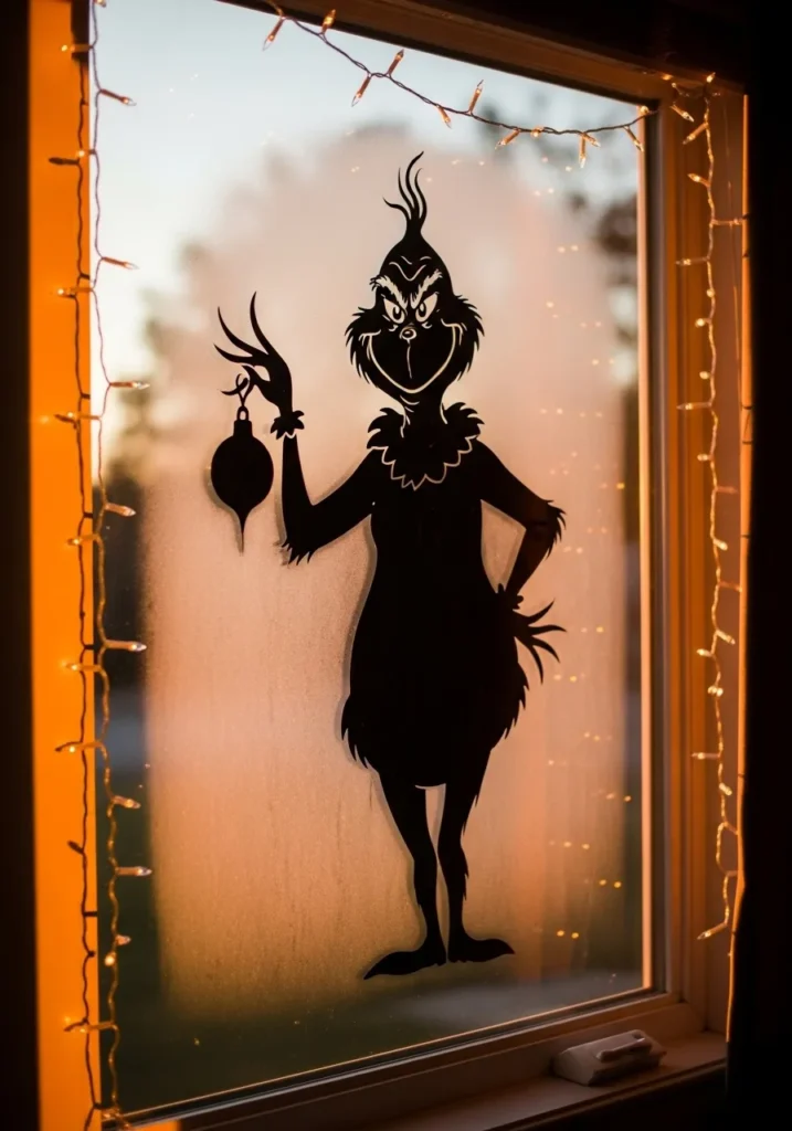 This creative window décor idea is perfect for adding some festive humor from the inside out. A large Grinch silhouette holding an ornament stands out beautifully against the softly lit backdrop, framed by twinkling string lights. It’s bold, dramatic, and full of mischief—just what you’d expect from the Grinch himself.