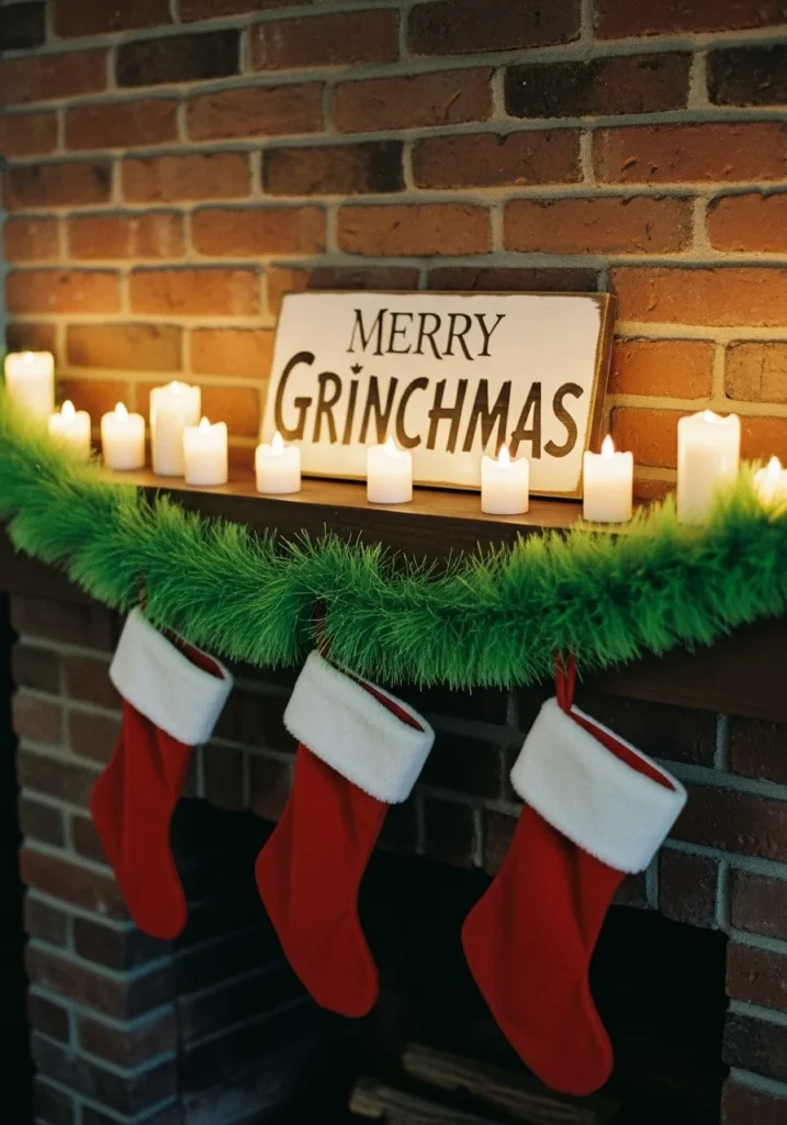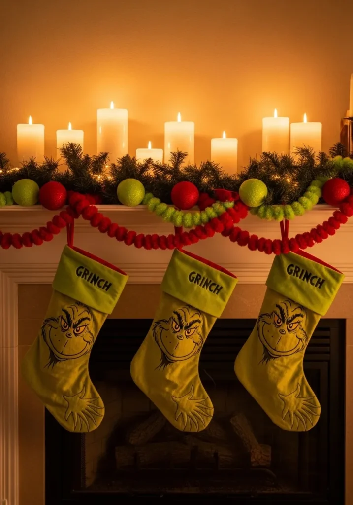 This cozy fireplace setup nails that perfect mix of classic Christmas and playful mischief. Bright yellow-green stockings with the Grinch’s smirking face hang beneath glowing candles and garland, surrounded by red and green ornaments. The warm candlelight gives everything a soft, cozy glow.