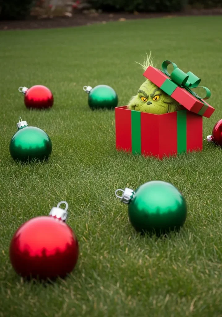 This outdoor décor idea is pure fun. A Grinch head popping out of a red-and-green present on the lawn looks like it’s about to cause some mischief. Scattered ornaments around the box make it feel like the Grinch has just unwrapped Christmas itself.