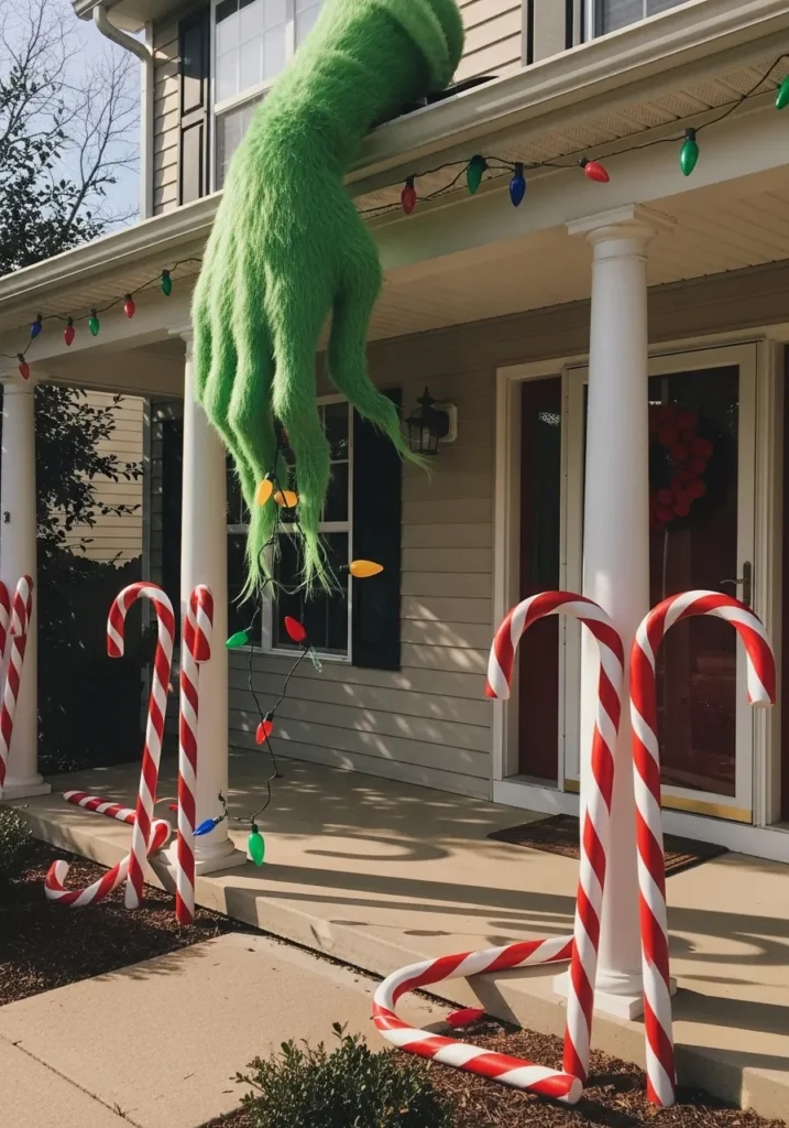 This front porch design is such a showstopper. A huge green Grinch hand hangs over the roofline, gripping a string of colorful Christmas lights. Oversized candy canes frame the porch, tying the whole look together in a perfectly over-the-top way.