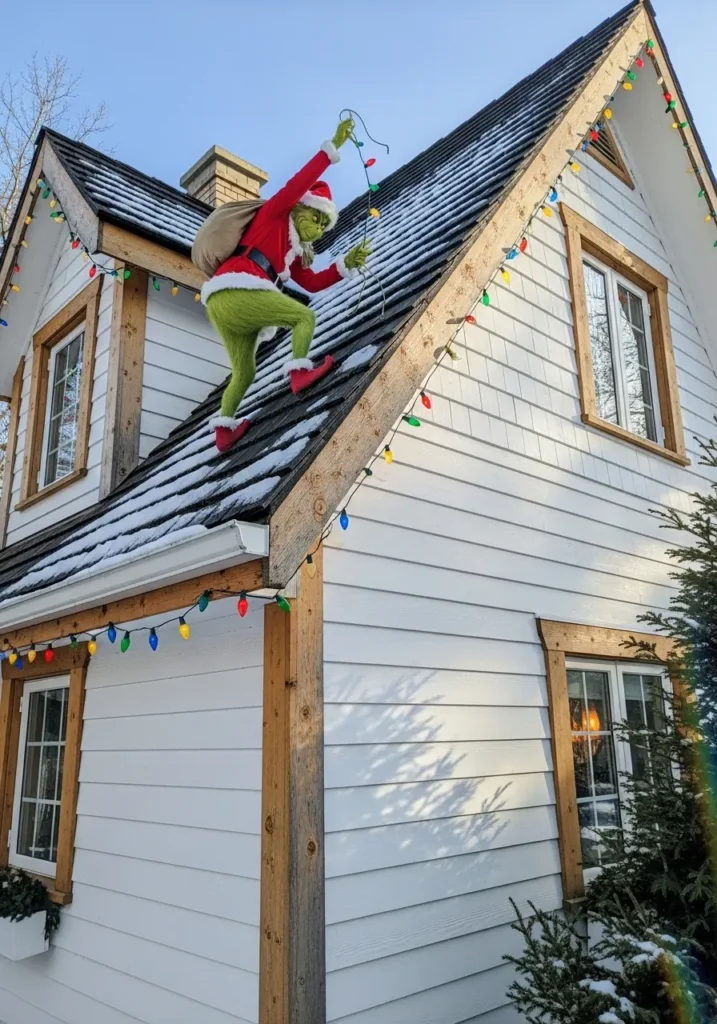 This clever roof decoration looks straight out of a Christmas movie. A life-sized Grinch figure is climbing the side of the house, string lights in hand, giving the impression he’s in the middle of stealing—or maybe returning—Christmas. The classic red and green colors pop beautifully against the snowy white siding and rustic wood trim.