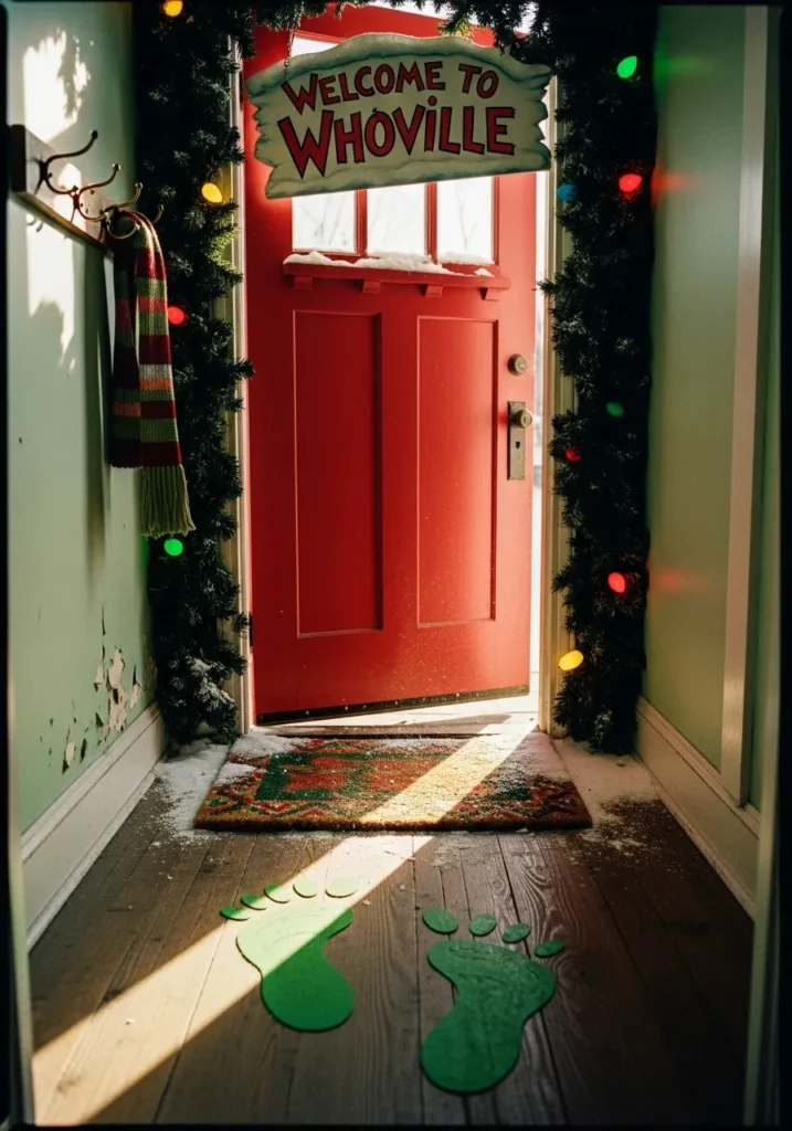 Walking through this doorway feels like stepping right into Whoville. A red front door framed with garland and colorful lights welcomes guests, while a cheeky “Welcome to Whoville” sign sets the scene. The green Grinch footprints on the floor are the perfect finishing touch—they instantly tell a story.