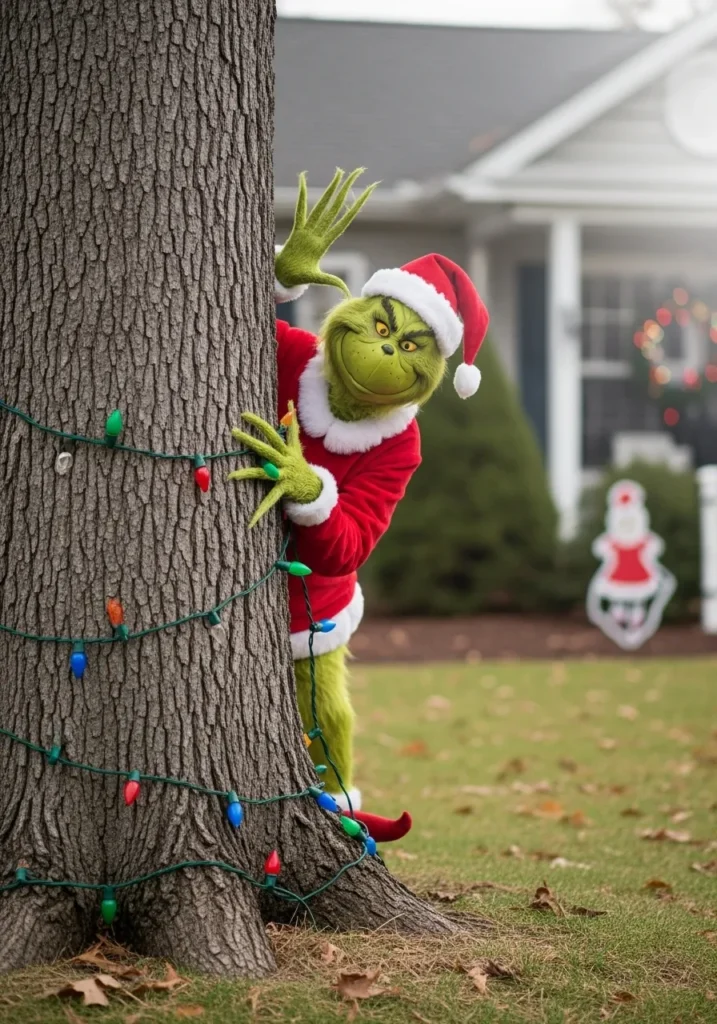 This outdoor scene is such a delightful surprise. A full-size Grinch figure peeks out from behind a tree wrapped in colorful lights, looking mischievous as ever. The green and red suit stands out against the neutral background, making the whole setup instantly eye-catching.