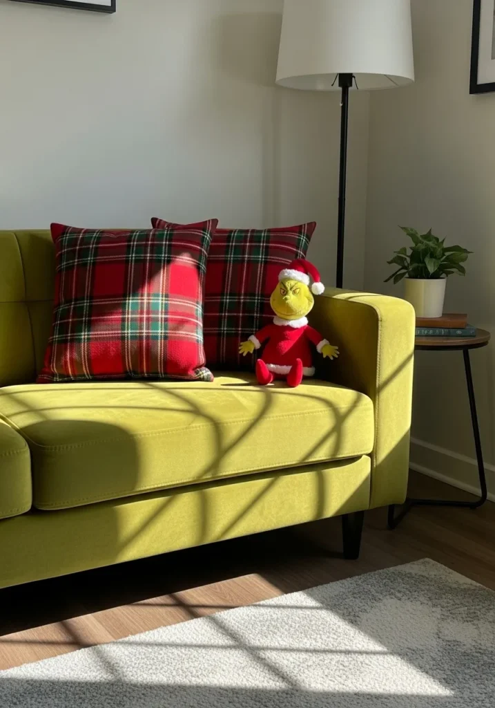 This cozy living room feels perfectly festive with its mix of playful and classic touches. A bright green sofa echoes the Grinch’s iconic color, while the red plaid pillows add that warm, traditional Christmas feel. Perched right on the armrest, a small Grinch plush toy ties it all together with a cheeky grin.