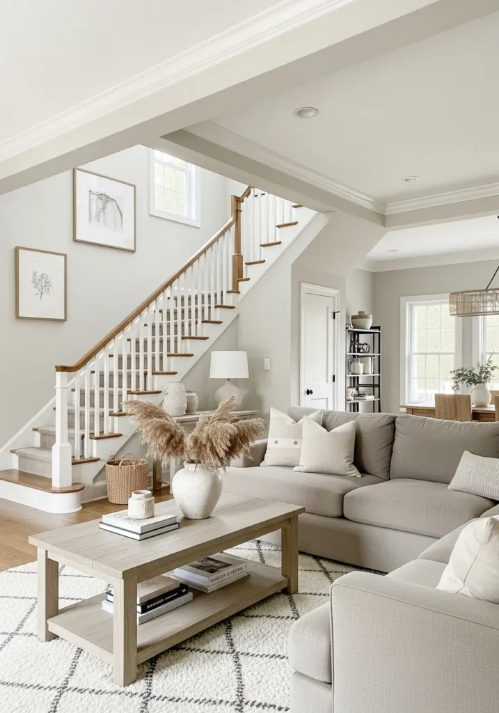 This looks closest to Benjamin Moore Pale Oak (OC-20), a soft greige that leans slightly warm but still feels light and airy. It has that easy middle-ground quality that works across open areas, especially when you can see it move from the living space toward the staircase without feeling like a change .