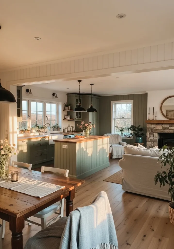 Saybrook Sage leans slightly earthy, especially next to wood counters and flooring. It can read a bit deeper in shaded areas, but it stays calm overall. I’d keep the wall color light and warm so the green doesn’t feel too cool. It works well when the rest of the space stays simple and a little softened.
