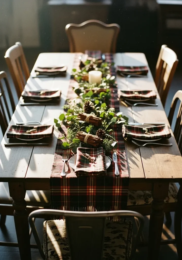 This table setting feels like the perfect mix of warmth and tradition. The wooden table instantly gives off a rustic farmhouse vibe, while the red and green plaid runner brings in that classic Christmas coziness. Pinecones, sprigs of greenery, and bundles of cinnamon sticks line the center, creating a simple yet beautiful natural centerpiece. The soft morning sunlight streaming across the table makes the whole scene feel relaxed and inviting, like a quiet moment before the laughter begins.