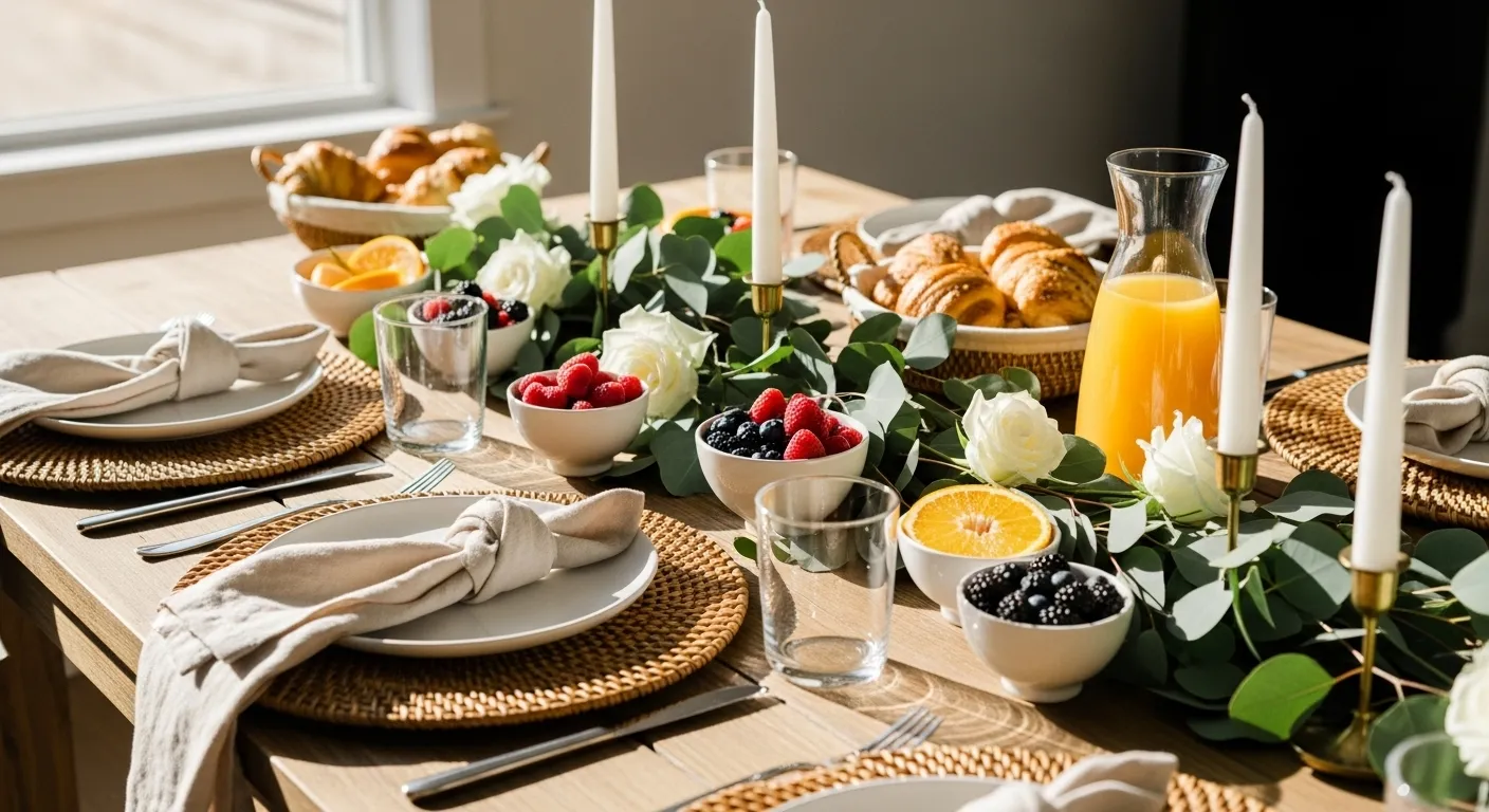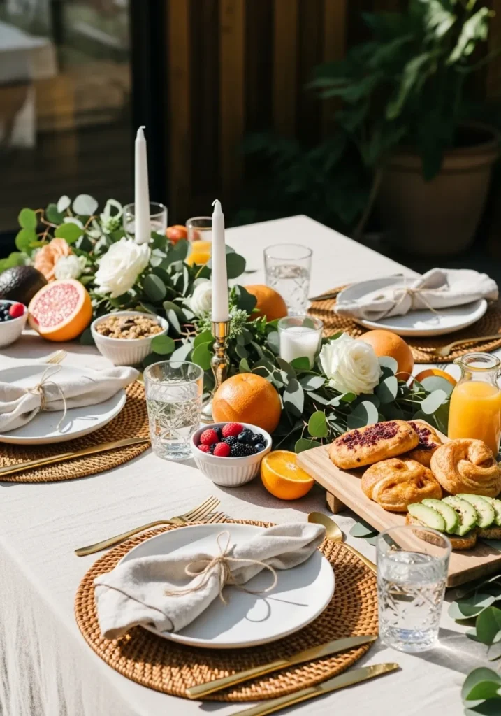 This cheerful setup is the definition of an inviting holiday brunch. The table bursts with color from sliced oranges, pomegranates, and berries mixed in with lush greenery and ivory blooms. Golden flatware, woven placemats, and glowing candles tie everything together, while plates of fresh pastries and avocado toast make it feel warm and ready to enjoy.
