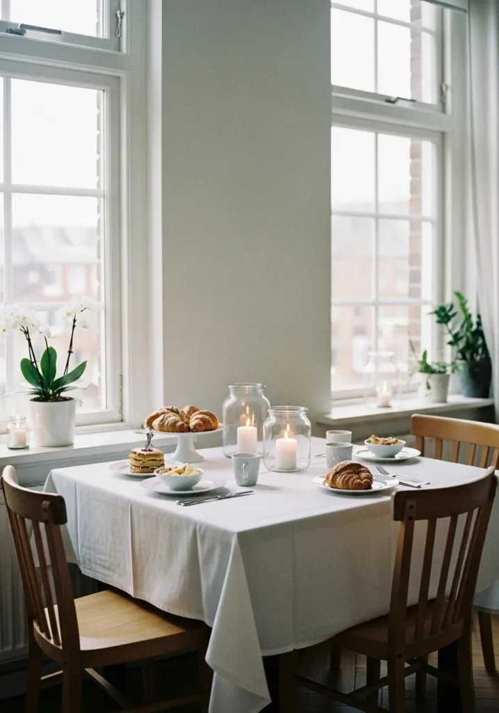 This sweet little nook feels like a quiet moment of Christmas bliss. A small white table is dressed with a crisp linen cloth, soft candlelight flickers in glass jars, and buttery croissants and pancakes wait to be enjoyed. The light streaming through the window makes everything glow softly, creating the coziest holiday breakfast scene.