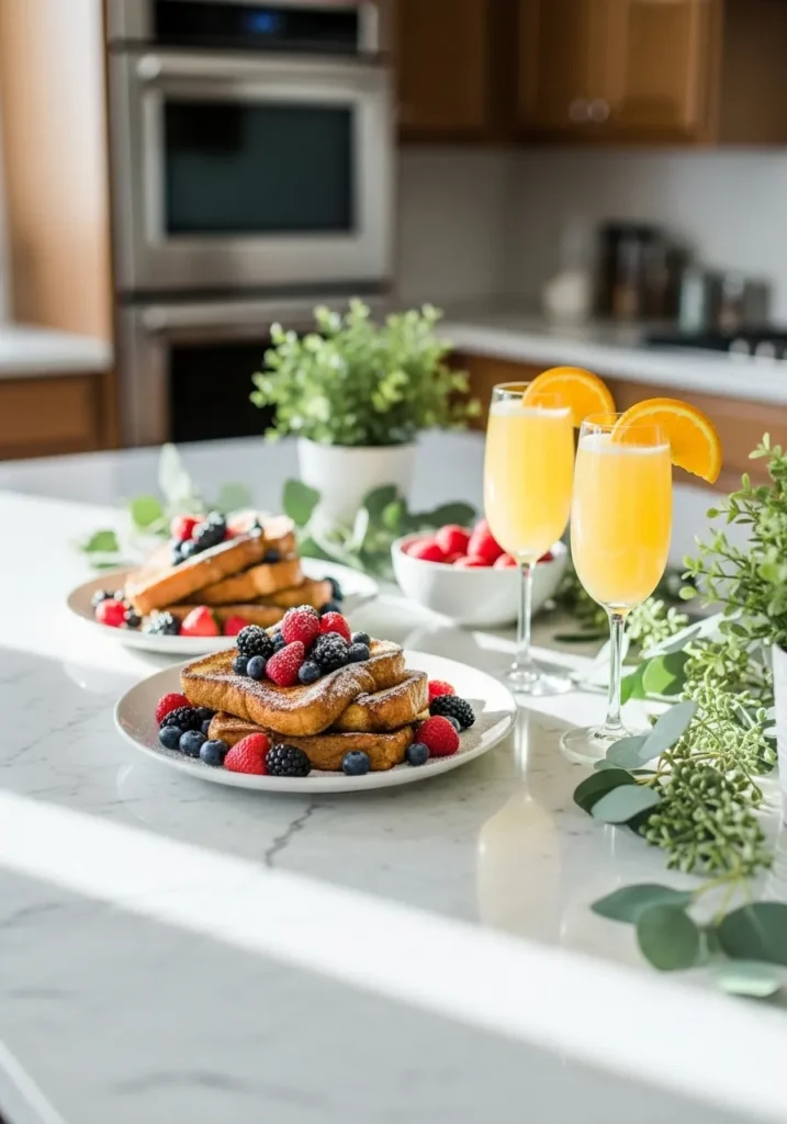 This bright and airy kitchen counter setting is a gorgeous example of a fresh, modern take on holiday entertaining, letting the food become the main décor. The white marble countertop is the perfect backdrop for vibrant colors, making the stacks of French toast absolutely pop, especially when drenched in an abundance of mixed berries like blackberries, raspberries, and blueberries. The minimal styling is elevated with a touch of nature—a small eucalyptus or similar greenery garland runs across the counter, and potted plants add life in the background, keeping the look incredibly clean and cheerful. The two mimosa glasses with their bright orange slices are the final, sunny touch to this lovely spread.