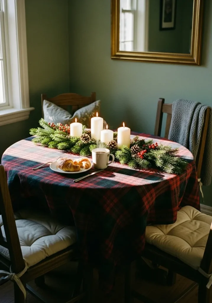 This beautiful image captures the essence of a warm, traditional holiday morning, centered around a cozy, round dining nook with lovely sage green walls. The star of the show is the plaid tablecloth in deep reds, greens, and blacks, instantly bringing a festive, cabin-like feel to the space. The centerpiece is a simple yet stunning arrangement of pine boughs, white pillar candles, and red berries, giving off that perfect, soft holiday glow, especially when paired with the natural light streaming in from the window. The wood chairs with their plush, off-white tie-on cushions look incredibly inviting, suggesting a leisurely breakfast right here.
