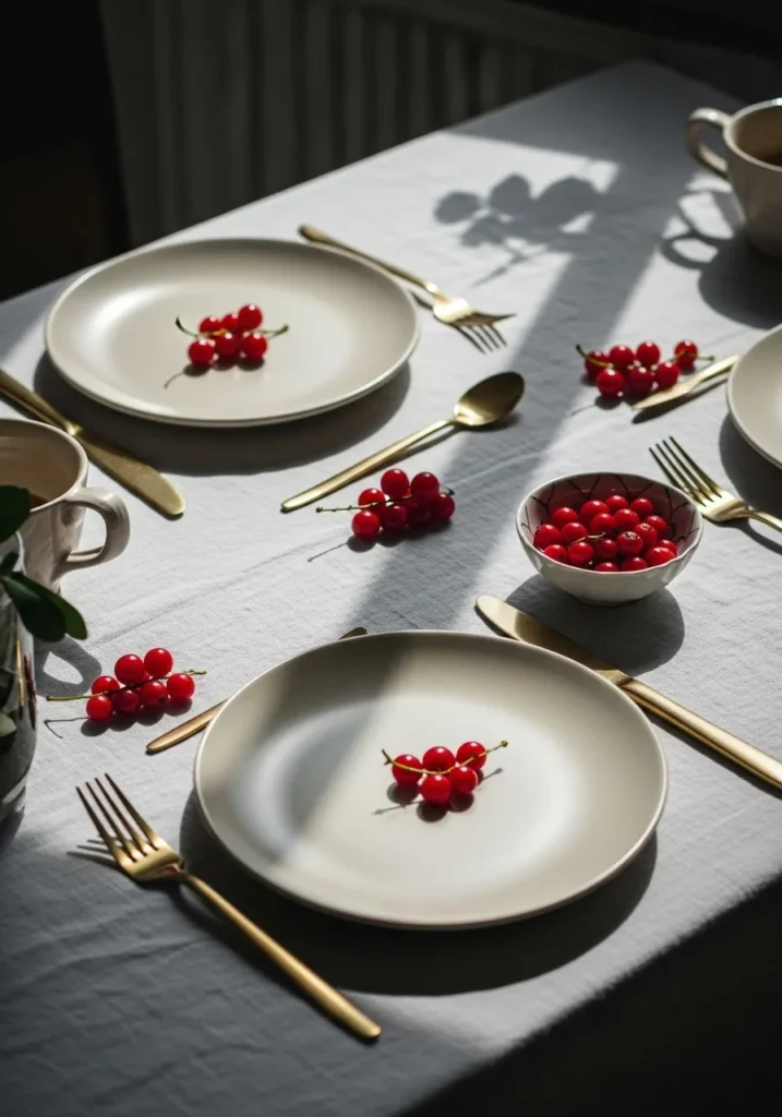 This tablescape is the epitome of modern, understated holiday style, perfect for those who lean into a more neutral and refined palette. A simple light grey linen tablecloth sets a serene foundation for the setting, beautifully catching the dramatic shadows of the morning light. The key design elements here are the matte, neutral-toned plates paired with striking gold flatware, which instantly elevates the whole look with a touch of glamorous shimmer. Instead of a large centerpiece, tiny, bright red bunches of red currants are sprinkled across the table and placed on each plate, creating a delicate, unexpected pop of festive color and texture.