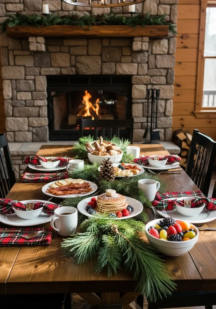 I honestly think this is just the ultimate dream for a holiday brunch, especially if you love that cozy, mountain retreat aesthetic. The way the light from the fire dances on the table, combined with all the natural elements, just makes you want to snuggle in for hours. Plus, that rich plaid against the natural wood is such a classic holiday look that never goes out of style. It truly feels like the kind of place where cherished memories are made, and who wouldn’t want a little bit of that magic in their home!