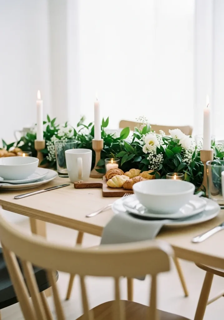 I absolutely love how this design keeps everything so clean and uncluttered, yet it still manages to feel incredibly festive and inviting. That combination of pale wood tones with the crisp white and deep green is just timeless and effortlessly sophisticated. It proves that you don’t need a lot of fuss or sparkle to create a dreamy holiday scene—just great natural light and a few beautiful green touches will completely transform a space. This is my go-to look for a host who wants an elegant brunch that feels totally relaxed.