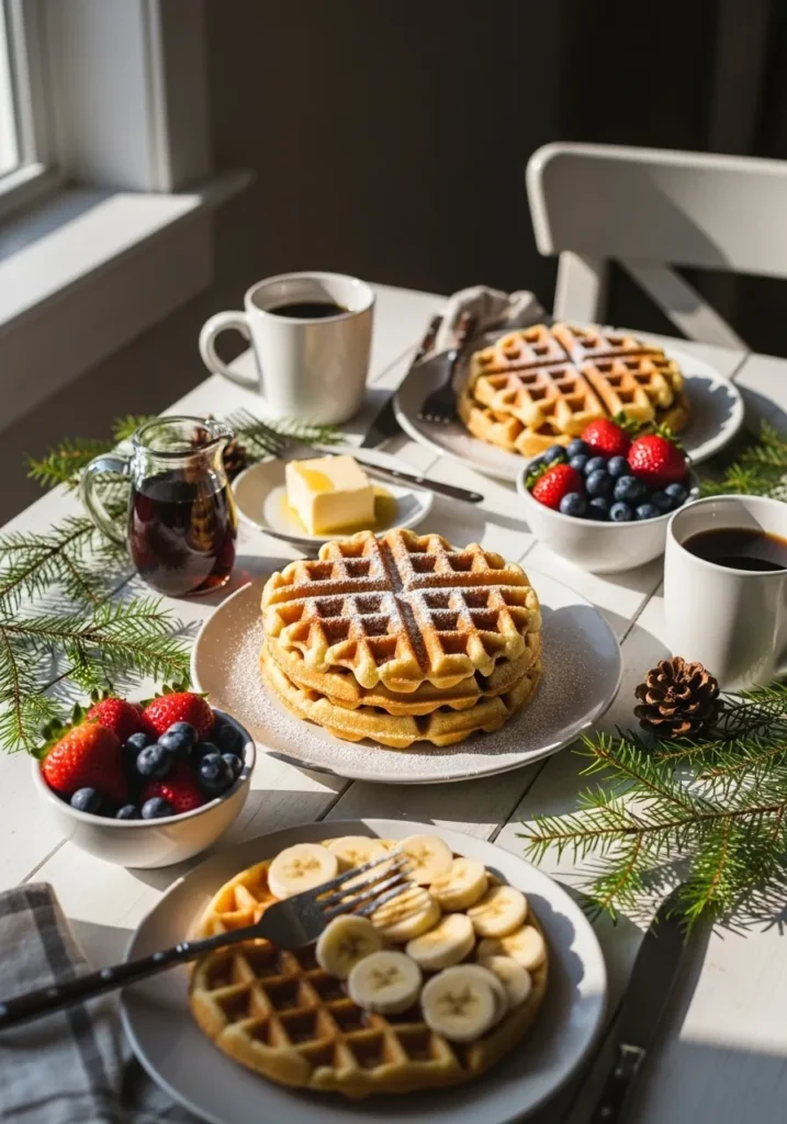 This charming dining space perfectly embodies a relaxed holiday morning, bathed in the lovely glow of natural light streaming in from the window. The setting features a simple yet inviting white wooden table, which provides a clean and bright canvas for all the delicious breakfast goodies. The decor keeps it minimal but festive with scattered pine sprigs and a few pinecones, adding a touch of natural holiday cheer without overwhelming the space. Plates of fluffy waffles are the stars, adorned with fresh berries, sliced bananas, and a dusting of powdered sugar, making the whole scene look incredibly appetizing and welcoming. It’s an unfussy yet utterly delightful setup that’s all about enjoying good food and good company.