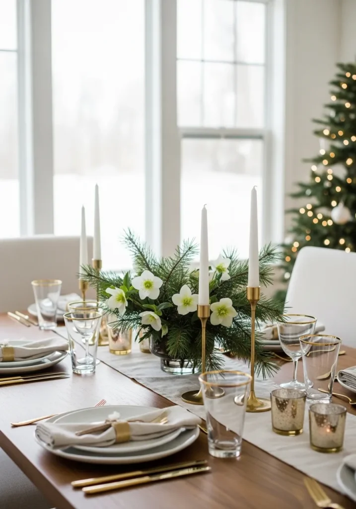 This tablescape is the epitome of sophisticated holiday style, blending contemporary clean lines with classic festive touches. The setting is bright and open, featuring a long, warm wood table and chic, modern white upholstered chairs that create such a crisp backdrop. The decor is elevated with a luxurious use of gold accents, visible in the sleek flatware, the rim of the glassware, and the stunning candlestick holders. The centerpiece features a mix of fresh pine boughs and delicate white hellebore flowers, bringing a touch of natural beauty to the refined space. Off to the side, a beautifully lit Christmas tree confirms this is the perfect spot for a festive meal.